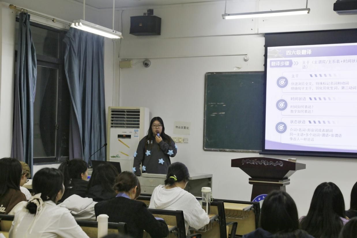 随后,张玥同学对大学英语四六级考试中的翻译与阅读这两大板块的通关经验进行了详细阐述。她以播放中文歌曲的方式进行引入,着重强调翻译的核心在于“通俗化”,并围绕答题步骤、翻译中时间与数字的表达等关键要点,结合具体实例传授了避免语法错误、准确传达原文意思的技巧。她将阅读板块具体划分为快速阅读、选词填空和仔细阅读三部分,通过揭示单词规律、抓取特征词和关键词的方法,有效应对文章篇幅长、内容繁杂、时间紧迫等难题。在仔细阅读部分,她深入分析了文章结构与解题思路,指导同学们通过题干把握主题、探寻作者态度,从而迅速确定正确答案。