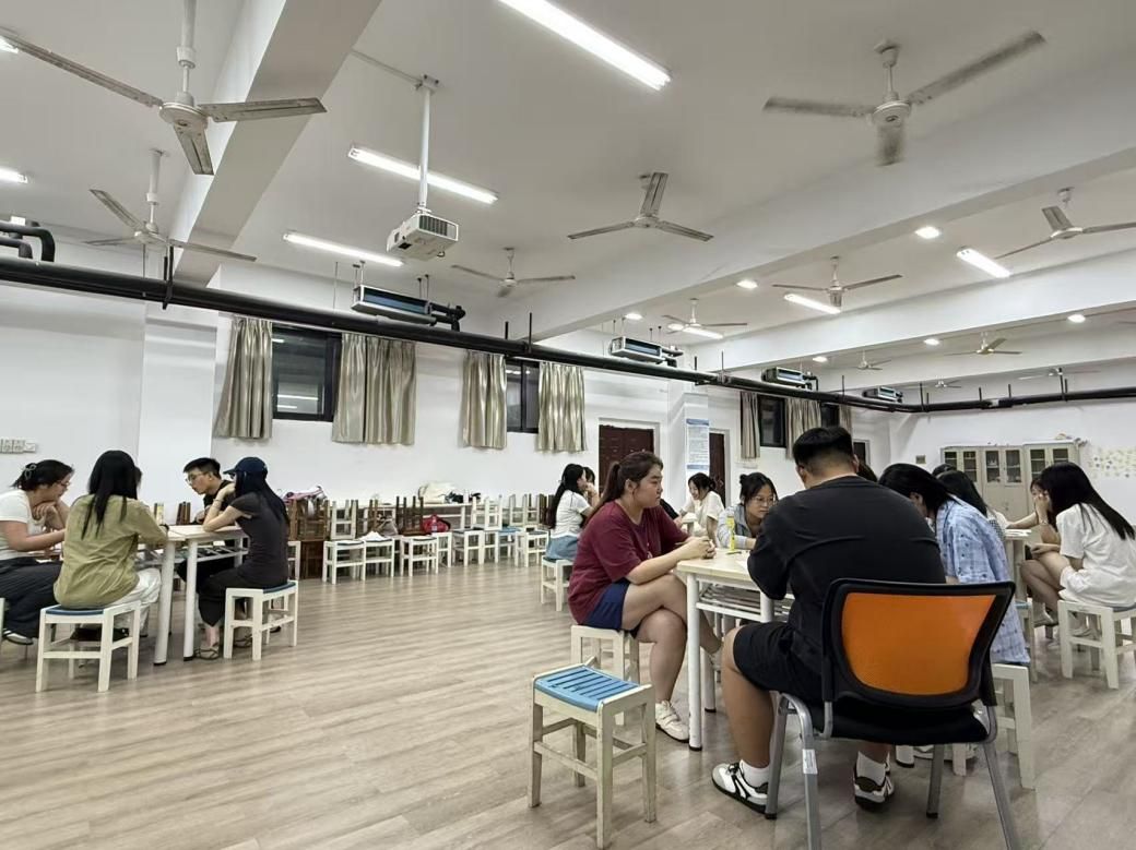 核心环节三项任务层层递进。“寻找队友”中,新生随机领取图形暗号卡片,蒙眼禁言仅靠暗号组队,违规者需学青蛙跳。大家通过手势、轻触传递信号,任务后各小组用2分钟相互认识、分享思路。“解手链升级版”挑战中,小组围成圈交叉握手,需在手不松的前提下解“链”,完成时间影响后续选择权。新生分工协作,最终均成功解“链”。有同学感慨“大家一起商量就找到突破口,这是团队的力量”。“接力作画”将氛围推向高潮:新生选彩笔后,首位定不公开主题,每人20秒接力创作,作品涵盖“彩虹”“周末休闲时光”等。小组围绕创作思路、他人添加内容感受讨论命名,一位新生分享“队友在我画的‘湖’上画了小猫,因笔的颜色大家误认‘湖’为草地”,让众人领悟沟通重要性。