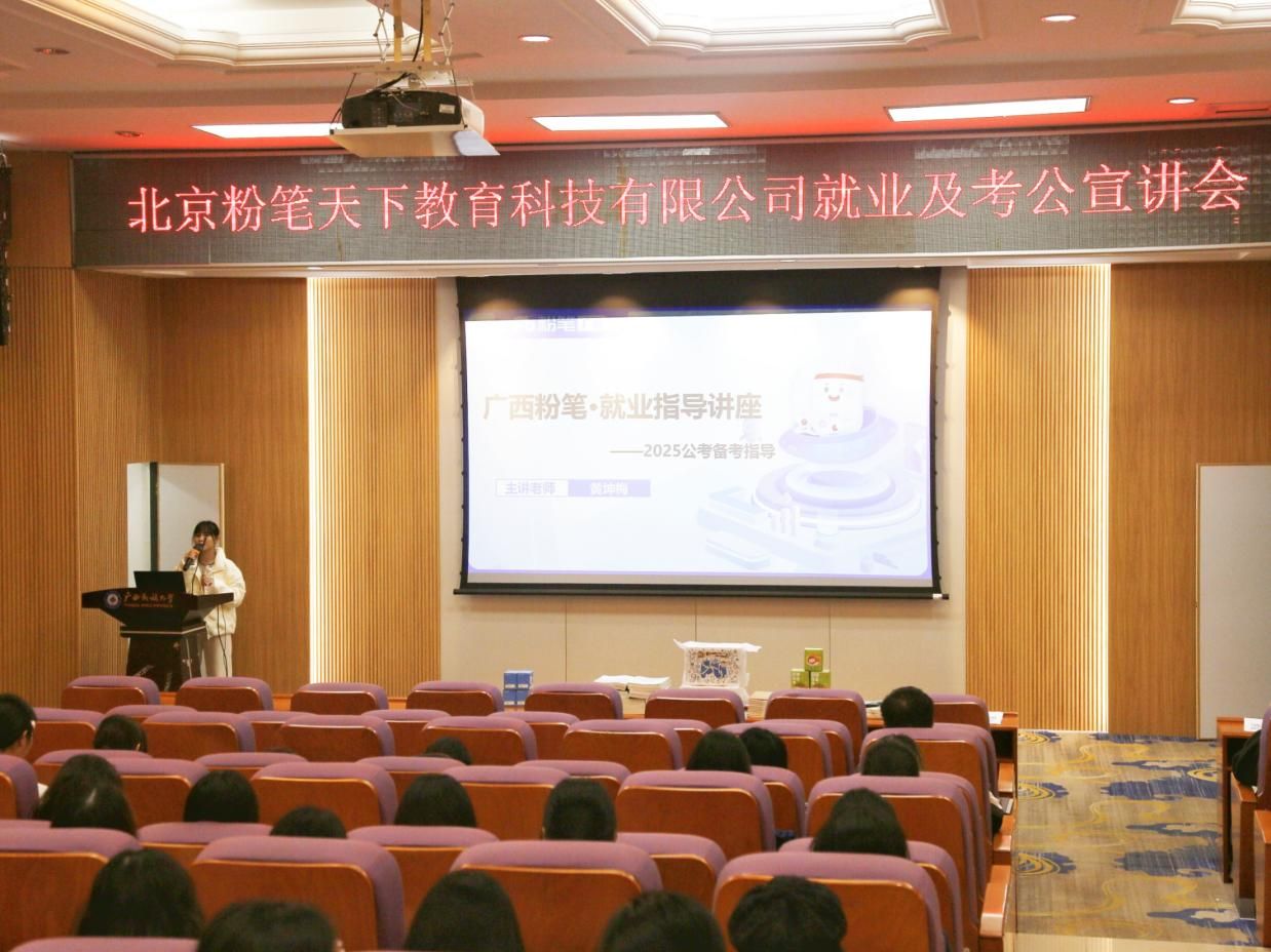 为精准匹配2026届毕业生就业需求,助力我院学子更深入地了解就业形势以及公务员考试相关流程,11月18日下午,我院在至善楼报告厅举办北京粉笔天下教育科技有限公司南宁分公司就业招聘宣讲会。此次宣讲会由粉笔教育黄坤梅老师主讲。