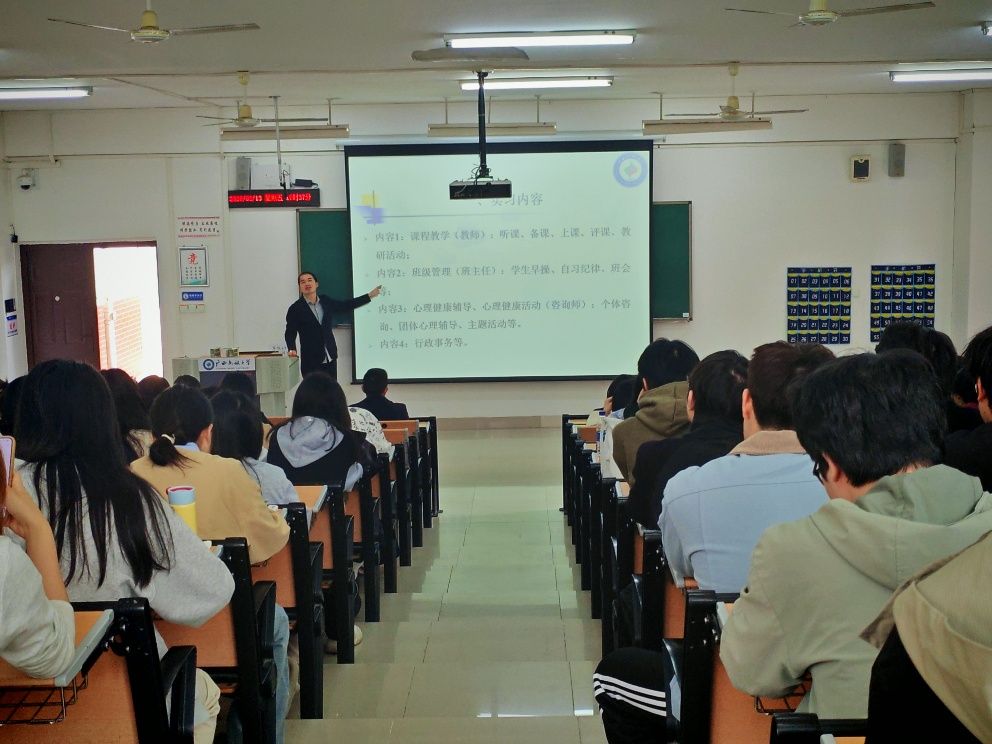 会议中,应用心理学系主任欧阳明昆老师对实习内容及要求进行了介绍。本次实习包含课堂教学、班主任管理、心理健康教育活动组织以及一般性行政事务。课堂教学包含备课、听课、授课以及课后复盘;班主任工作涵盖早读、晚自习看班以及班会组织;在心理健康教育领域,实习生将参与“525”心理健康活动月的设计与组织工作;行政事务包括监考、宣传拍照等日常工作。
