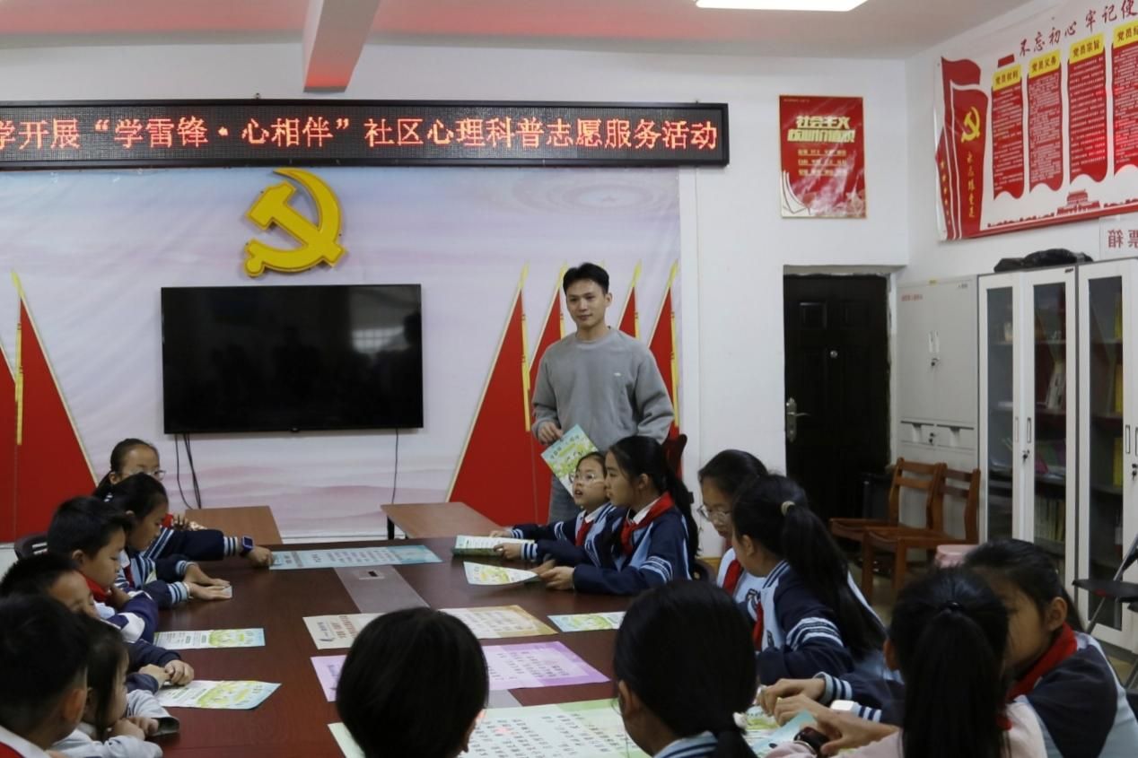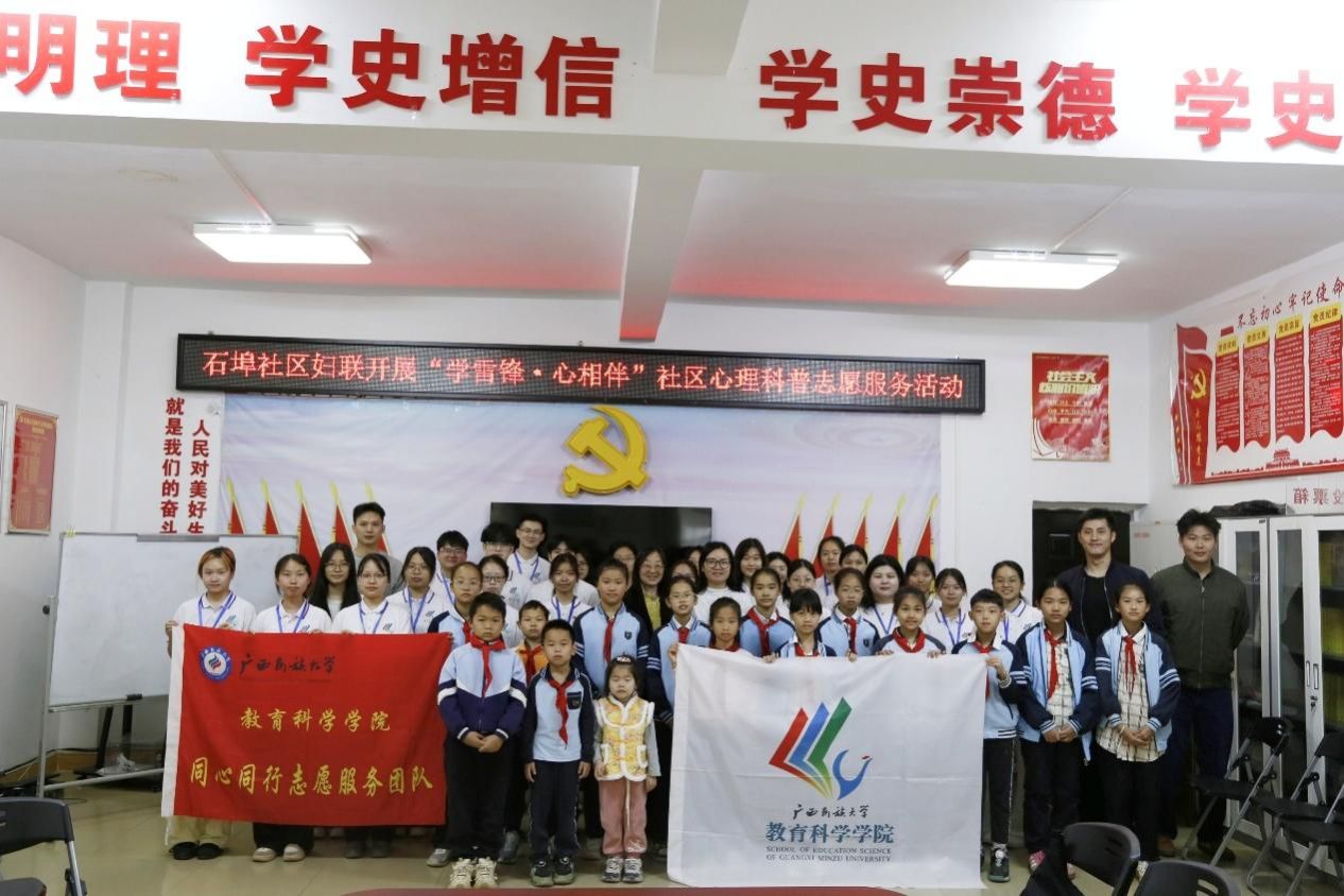 为弘扬雷锋精神,践行志愿服务理念,2026年3 月 21 日,广西民族大学教育科学学院团委学生会联合同心同行志愿服务团队、研究生心理社团,在学院党委副书记邹同霞、团委书记陆宇扬、辅导员黄勇林的带领下,前往石埠社区开展 “学雷锋・心相伴” 社区心理科普志愿服务活动。本次活动为南宁市鸿运小学的学生提供了专业且有趣的心理科普服务,同时以暖心行动传递了志愿力量。