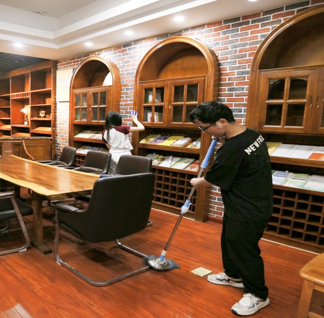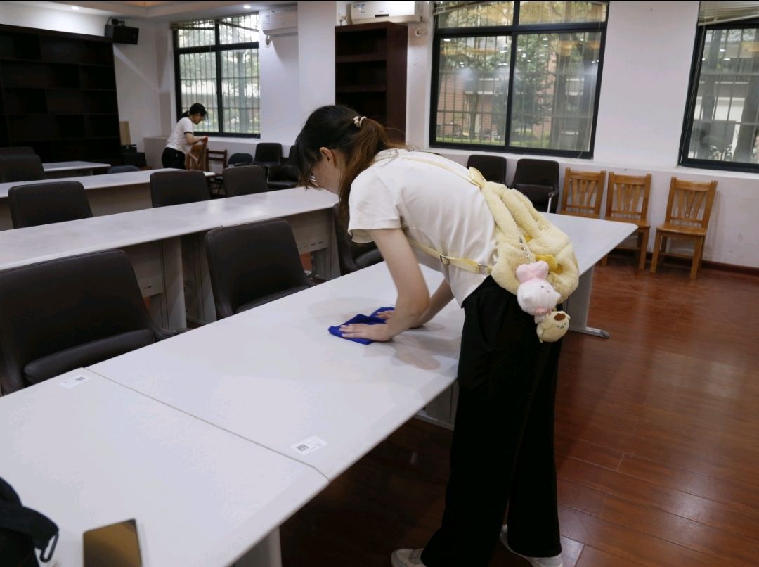 每个教室的布局不同,清洁难度也有所差异。在设有书架的教室,同学们会仔细擦拭每个书架的格子;在较为空旷的教室,大家则先将地面清扫干净,再用拖把拖得锃亮。在全体成员的齐心协力下,每间教室都变得一尘不染。每位同学都一丝不苟地对待自己的工作,即便是扫地、拖地、擦玻璃这些简单的任务,他们也始终以饱满的热情投入其中——这正是践行雷锋精神的意义所在。